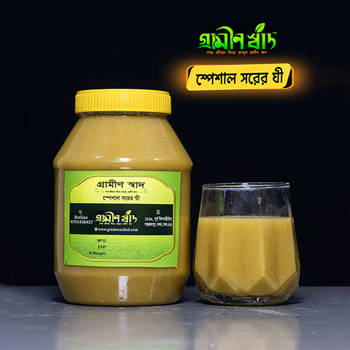 কুষ্টিয়ার বিস্তির্ণ পদ্মার চর এলাকায় প্রাকৃতিকভাবে বেড়ে ওঠা ঘাস খাওয়া দেশি গরুর দুধ থেকে উৎপাদিত প্রিমিয়াম গ্রাস ফিড স্পেশাল সরের ঘি । দুধ জাল দিয়ে সর তুলে সেই সর থেকে সম্পূর্ণ ঘরোয়া ভাবে তৈরি হয় আমাদের স্বরের ঘি। ঘি তে কোন কালার বা স্মেল বা ক্ষতিকর কিছু এড করা হয় না একদম রিয়েল টেস্ট আর স্মেল পাবেন ইনশাল্লাহ।